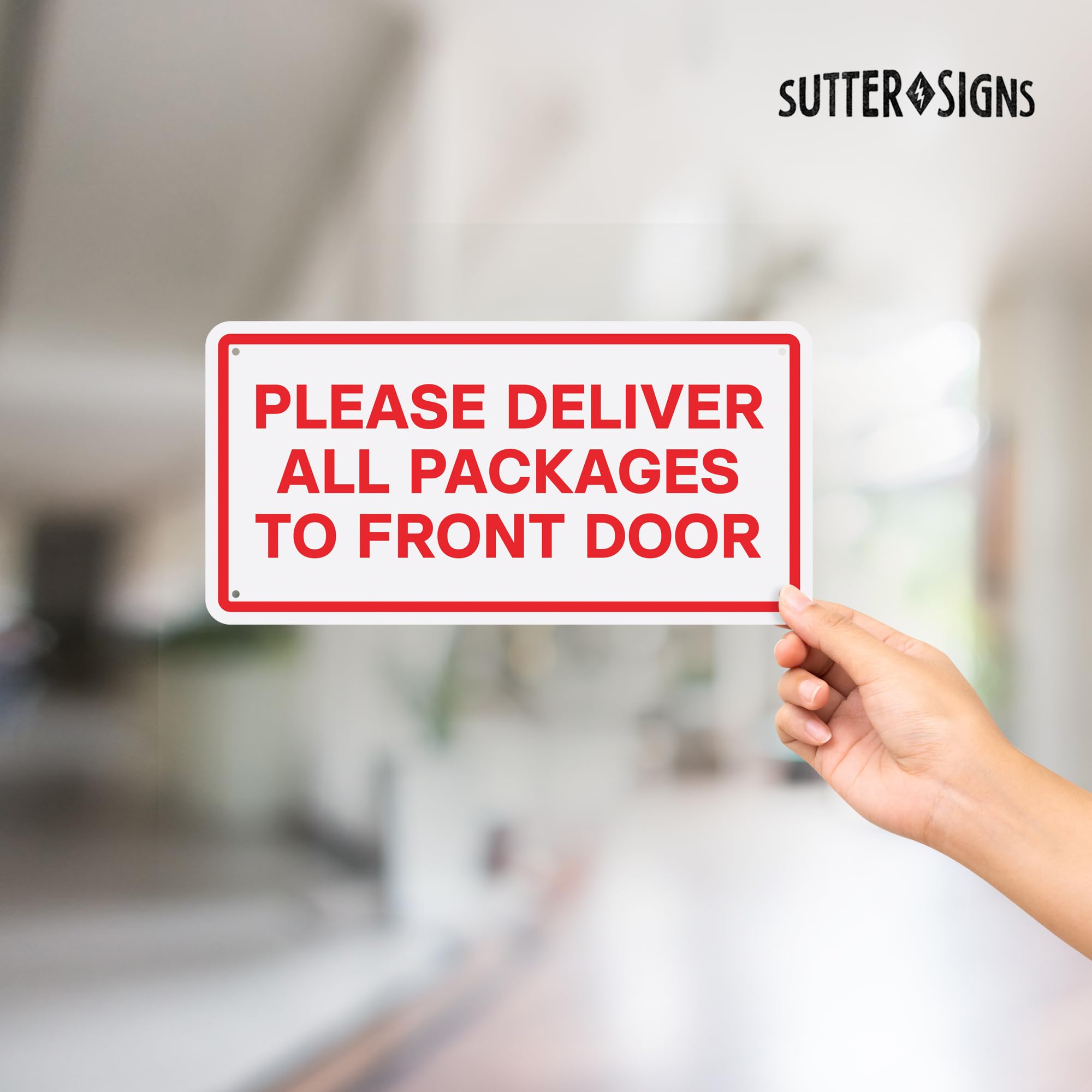 Bulk Case of 150 Signs - Please Deliver Packages to Front Door Sign, 12" x 6" Aluminum Delivery Sign for Home, Office, Commercial Buildings