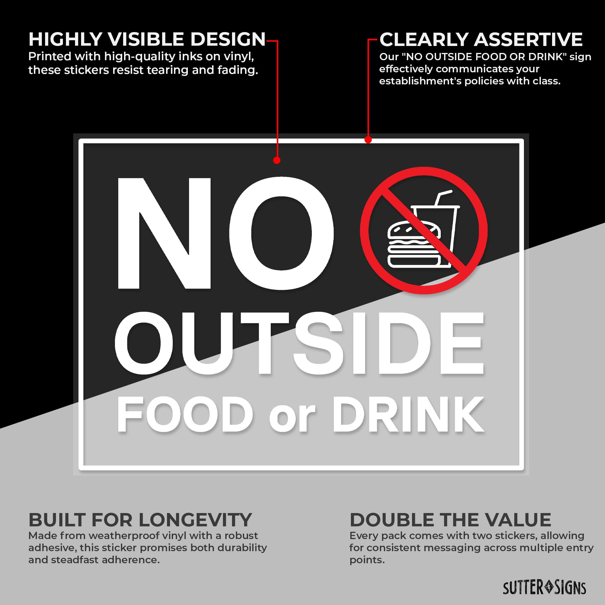 CLEARLY ASSERTIVE: Our "no outside food or drink" sign effectively communicates your establishment's policies with class.