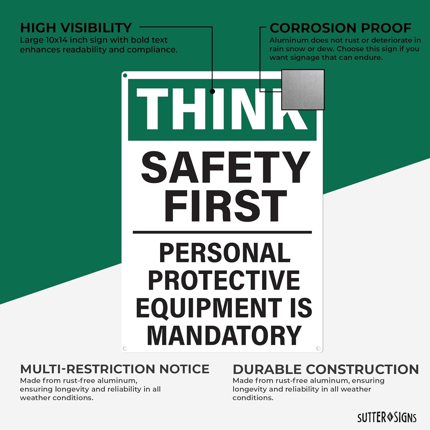 Bulk Case of 60 Signs - Safety First Workplace Sign | Personal Protective Equipment Required Workplace Safety Sign, 10x14 Inch Rust-free Aluminum