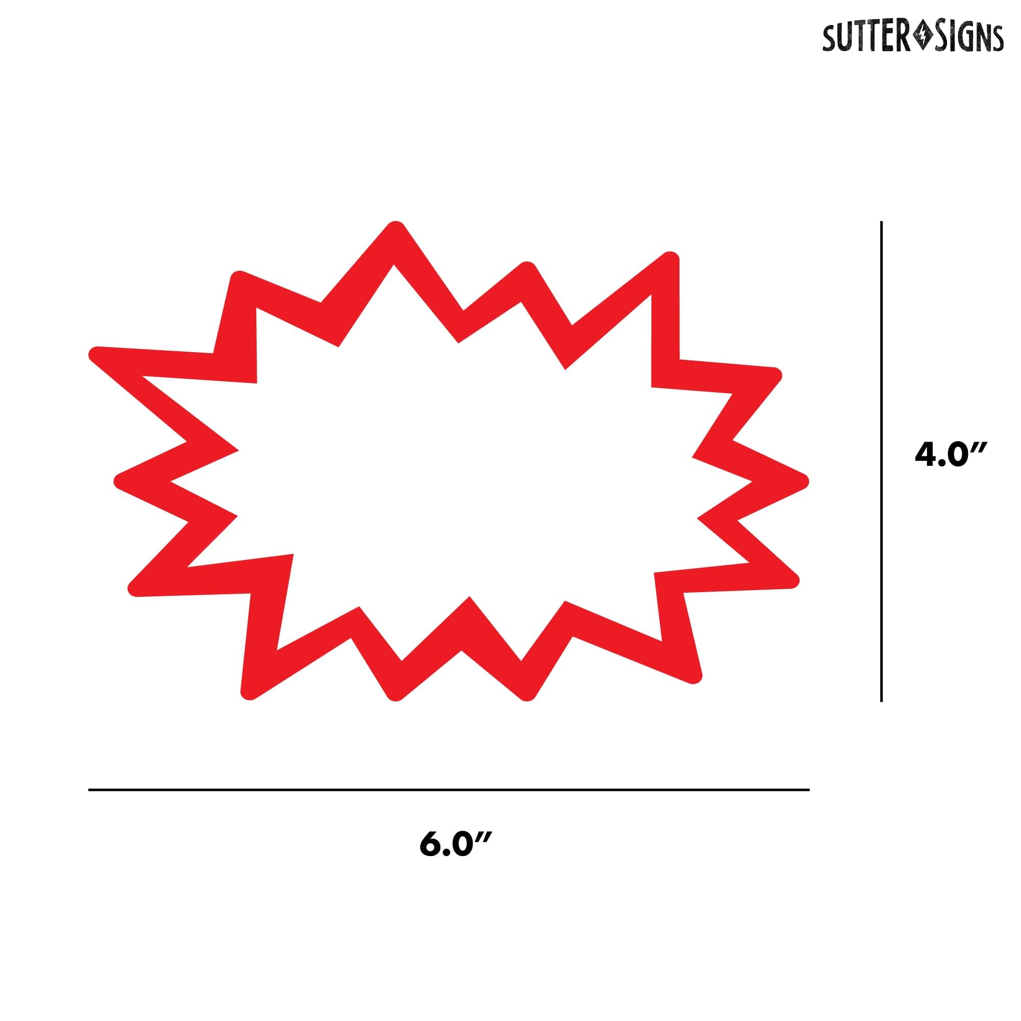 SIZE & COLOR | Each starburst measures 4" x 6" and is white with red outlines. If you are having a yard, garage, estate, or rummage sale, you may require different size signage depending on the size of the items for sale. Larger items like furniture, TVs, computers, or vehicles may need the 4x6 or 6x8 signs while smaller items such as books, toys, clothes, records, etc. can use the 2x3 or 3x5 signs.